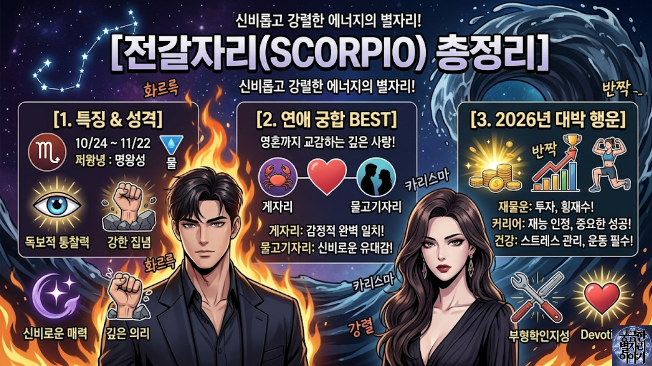 안녕하세요. 오늘은 12별자리 중 가장 신비롭고 강렬한 에너지를 지닌 전갈자리에 대해 상세히 알아보겠습니다. 한 번 목표를 정하면 끝까지 파고드는 집념과 통찰력을 가진 전갈자리는 알면 알수록 매력적인 별자리인데요. 오늘 포스팅에서는 전갈자리 생일 특징부터 타고난 성격, 그리고 가장 궁금해하실 2026년 전갈자리 운세와 연애 궁합까지 핵심 정보만 총정리했습니다.